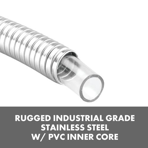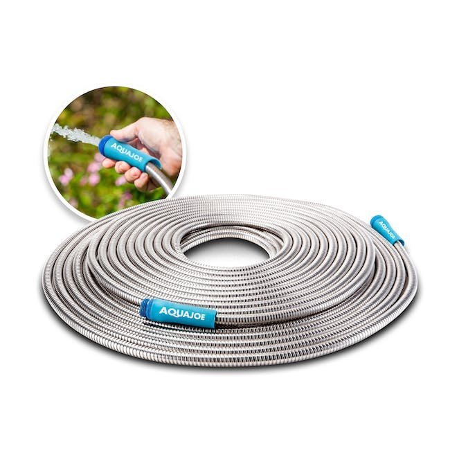 THE STAINLESS STEEL HOSE THAT’S AS TOUGH AS NAILS! AQUA JOE’s lightweight stainless steel hose is quite simply the last hose you’ll ever need! Made from high-quality industrial grade 304 stainless steel for a lifetime of reliable use in your yard and garden. Won’t cut, crush or crack – won’t split, kink or get hot in the sun. It’s the one hose that works as hard as you do. A rugged, virtually indestructible and puncture-proof stainless steel outer sheath surrounds a flexible PVC inner core, for maximum performance and durability, and features bend restrictor collars and durable aluminum fittings at each end for unrestricted water flow and secure, leak-proof connections. Lead-free, phthalate-free and BPA-free. Perfect for watering the flowers, washing the truck, rinsing patio furniture or connecting to sprinkler or pressure washer.
