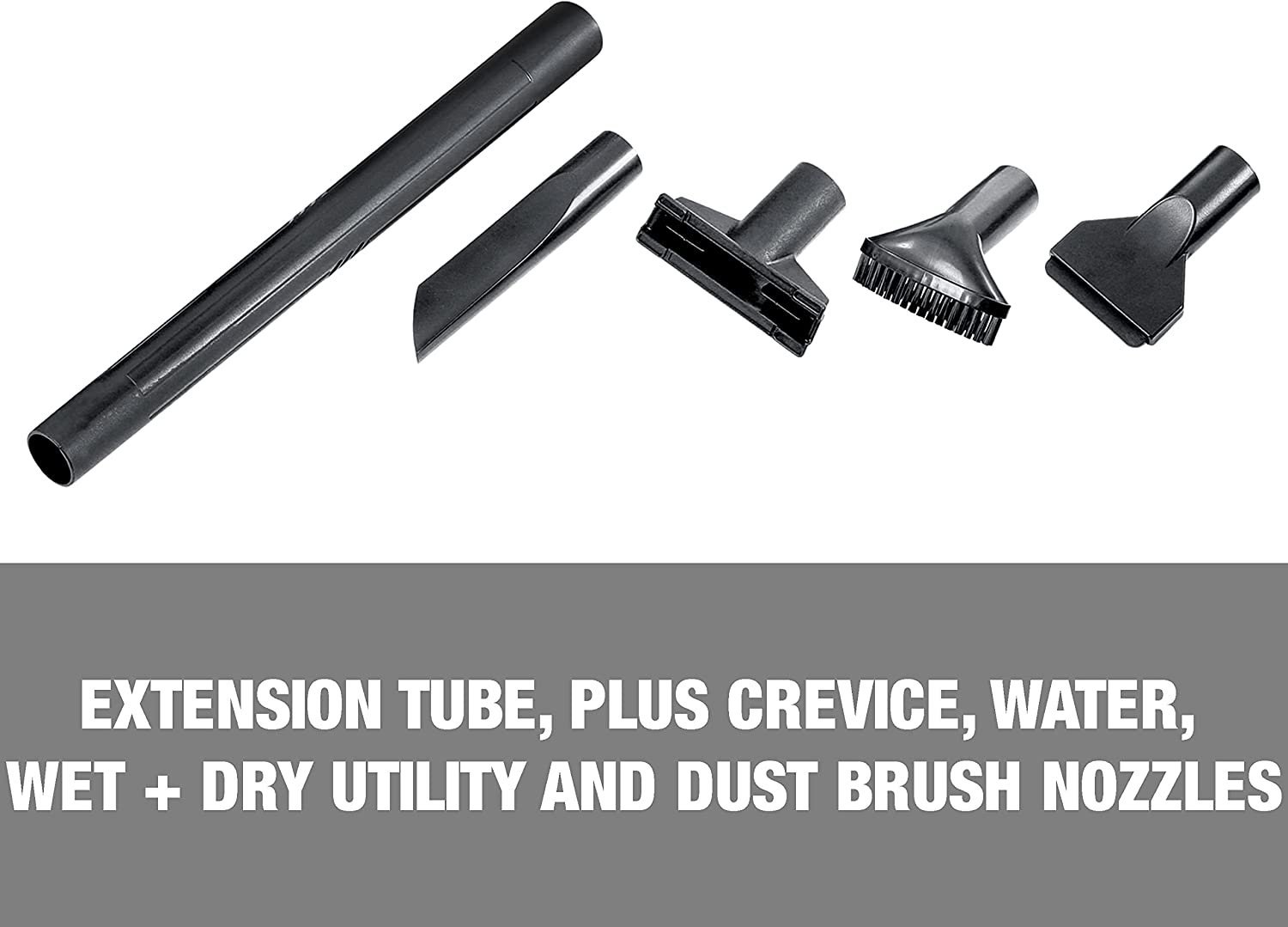 - 6-PIECE ACCESSORY KIT: Comes with an extension tube, crevice nozzle, water nozzle, wet + dry utility nozzle, dust brush nozzle, carrying bag