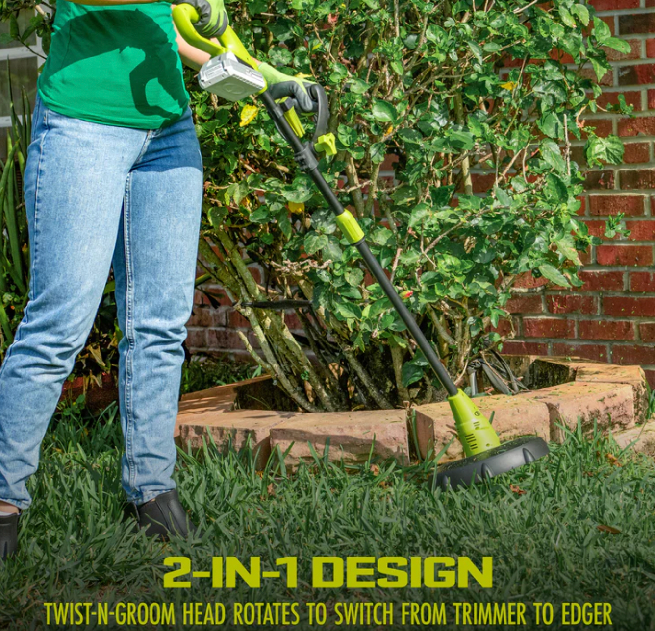 No more struggling with string — the 24-Volt stringless trimmer features patented SharperBlade Technology. The self-sharpening, 10″ precision cutting blade slices through tough grass, thick thatches, and unwanted weeds without kinks, tangles, or jams! Plus, the built-in flower guard protects against accidental blade contact with delicate plants. Or twist it up + switch it up! The 180 rotating Twist-N-Groom head converts from trimmer to edger in seconds. Edge along flowerbeds, sidewalks, and walkways for a crisp, precise line — every time.