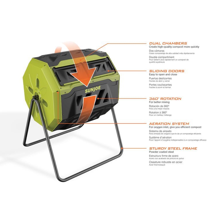 Restored Sun Joe SJ-CMPS1 | All-Season Outdoor Tumbling Composter | Dual Sliding Chamber | 42-Gallon | 2-10 Weeks | BPA-Free Material (Refurbished)