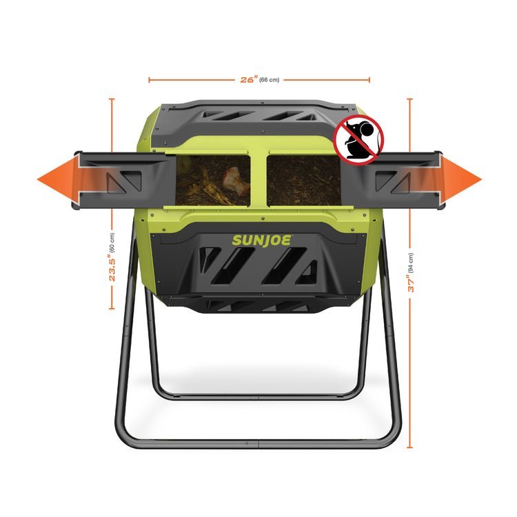 REDUCE, REUSE, RECYCLE — COMPOST! Turn your food scraps and yard waste into nutrient rich compost with the Dual Chamber Tumbling Composter from Sun Joe. This low odor, UV-resistant, waterproof barrel composter is the perfect addition for any homeowner who wants to reduce their carbon footprint and waste. The 360 octagon shaped tumbling design keeps hands clean + outdoor spaces neat – no more digging through a bin full of decomposing waste. The highly-efficient tumbling action and advanced aeration system speeds up the composting process in weeks! Simply load your biodegradable materials into either chamber, and you’ll have nutrient-rich compost in just 2-10 weeks. And the roomy 42 gallon capacity means you can load up to 330 lbs of waste to compost! So, give it a spin – join the composting community – and Go With Joe!