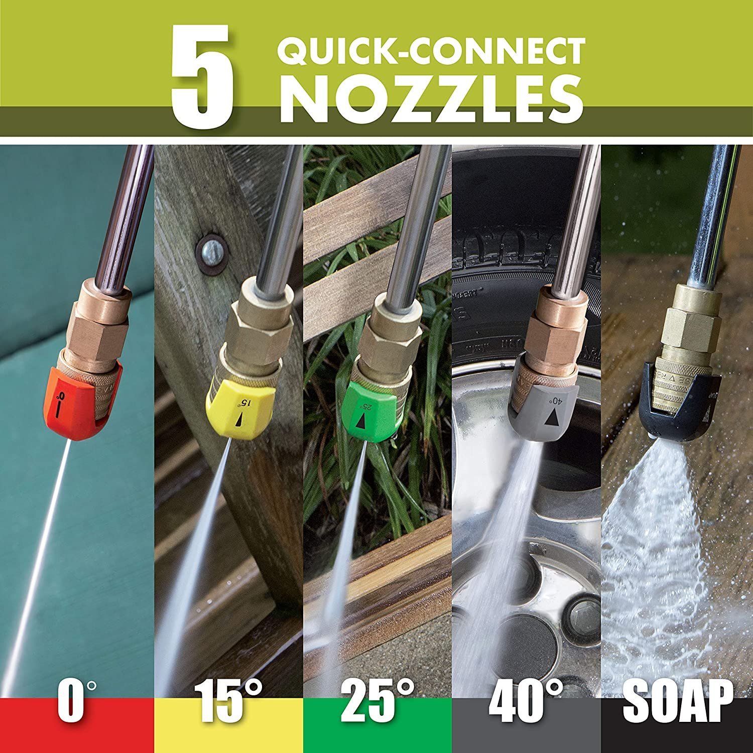 - 5 Quick-Connect spray tips (0o, 15o, 25o, 40o and soap) tackle light, medium and heavy duty cleaning tasks